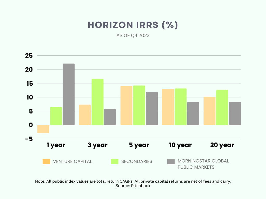 Secondaries is less volatile than VC and has generated better Horizon IRRs than VC and public market in the last 20 years.